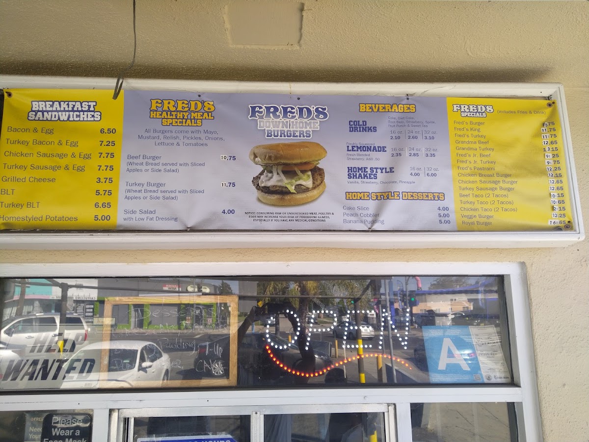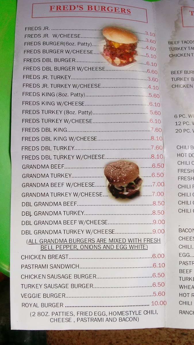 Burger selections include a range of specialty items like turkey burgers, chili cheeseburgers, and various cheeseburger options, often accompanied by fries. Additionally, there are hot dogs and beef tacos as alternative protein choices. The homestyle desserts category includes options like cake slices and banana pudding for those looking for a sweet finish.