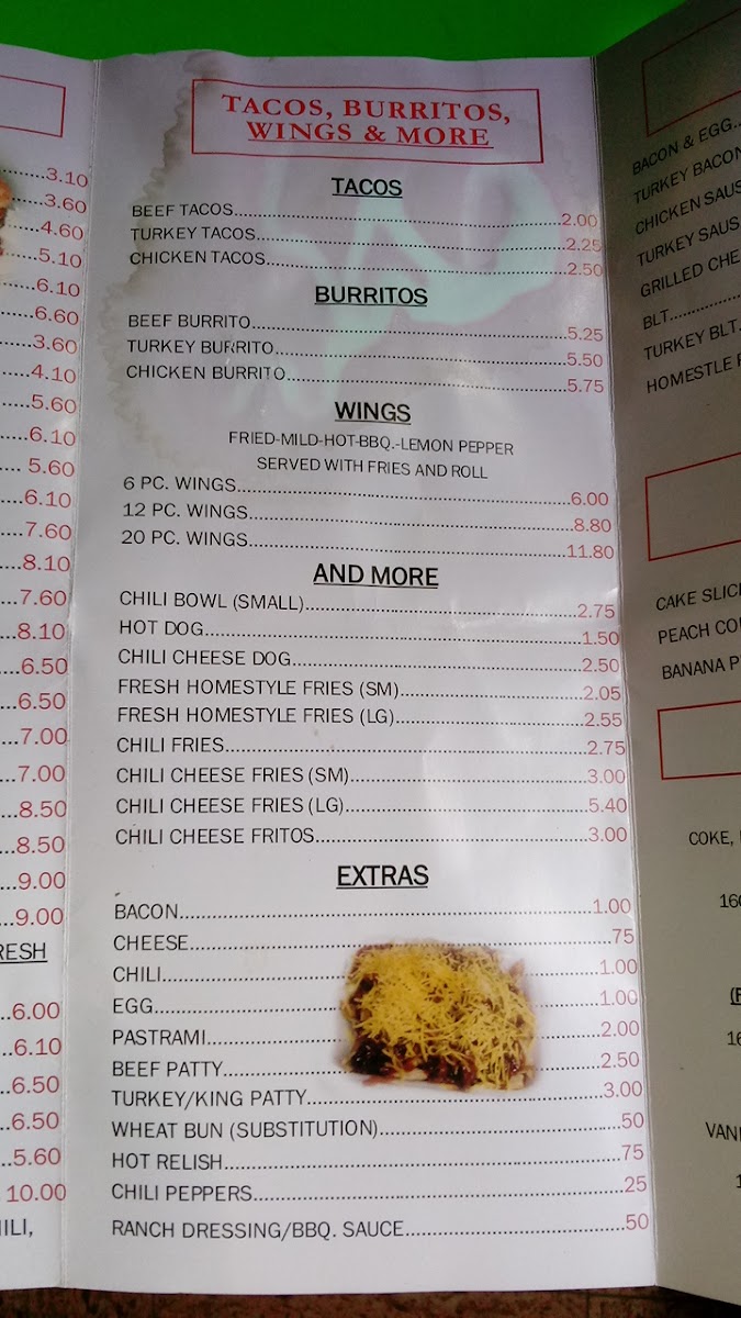 The menu offers a variety of American fast food options centered primarily around burgers and sandwiches. It is structured into several key categories including breakfast sandwiches, wings, and homestyle desserts. Visitors can find classic breakfast items such as bacon and egg sandwiches, turkey BLT, and grilled cheese. The wings section provides flavored options served with fries and a roll, suitable for a light meal or snack.
